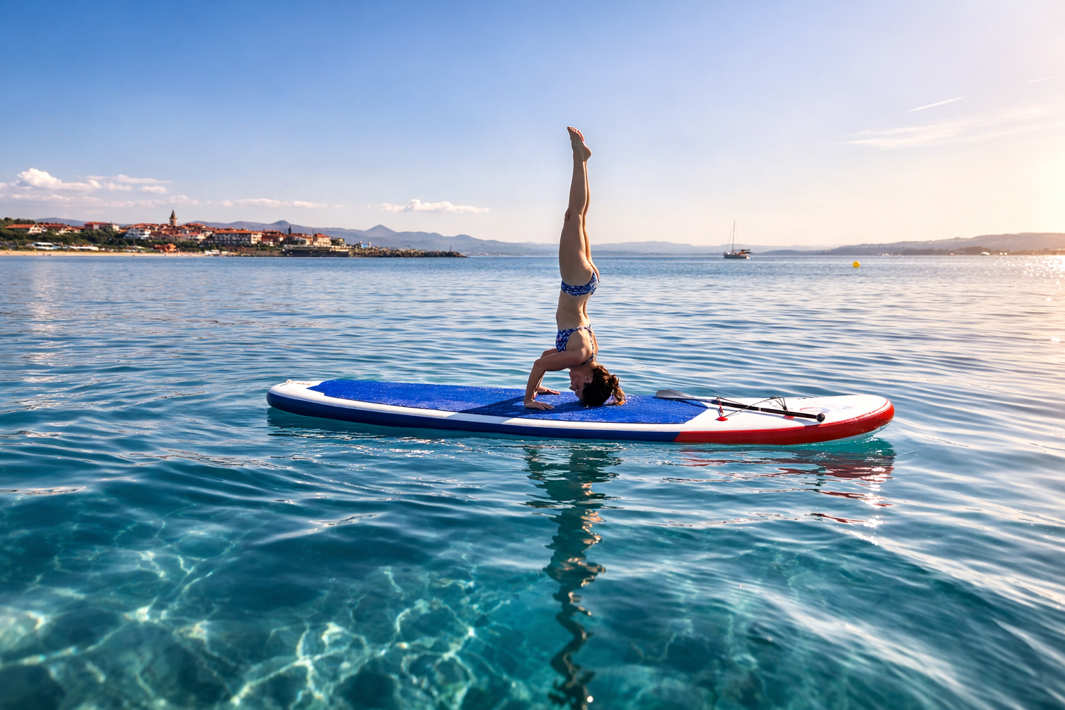 Vivez une séance de yoga paddle dans la baie de Txingudi à Hendaye, au Pays Basque. Une expérience bien-être unique sur l’eau, accessible à tous, entre détente, équilibre et nature.